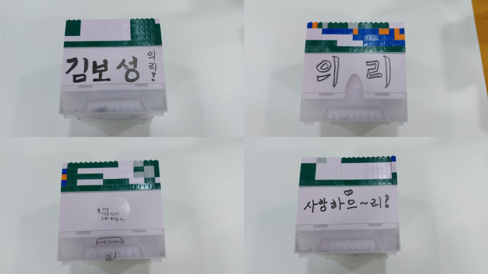 재활용 플라스틱 블럭으로 만들어져 4면이 모두 다르답니다.