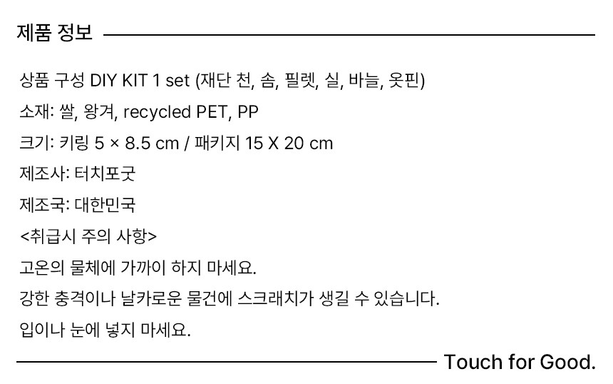 소잉, 수선, 뜨개질이 휴식과 지속가능 문화으로 자리잡고 있습니다. 어디서 시작해야 할 지 막막했다면, 작은 쌀알로 도전해보는 건 어떨까요? 바늘과 실도 키트에 준비해 놓았습니다. 별도 준비물은 가위 단 하나!
