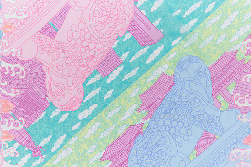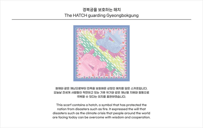 현대패션 스타일에 맞추어 실용적으로 몸에 착용할 수 있는 스카프로 제작하여 서울시민들과 서울의 방문자들이 악운을 쫓고 행운이 찾아오도록 의미를 담았습니다.