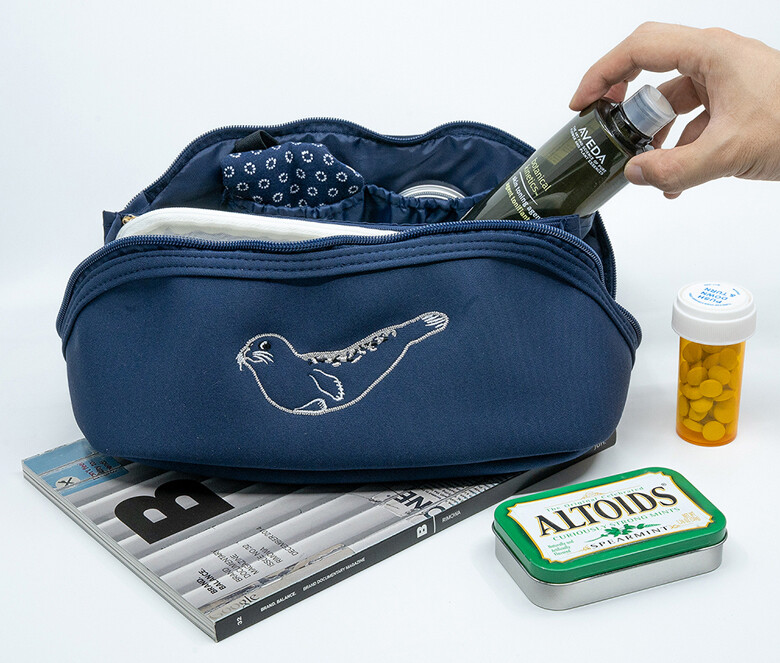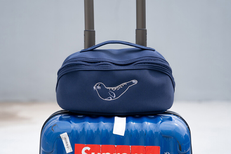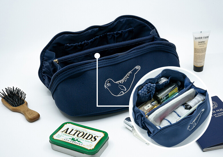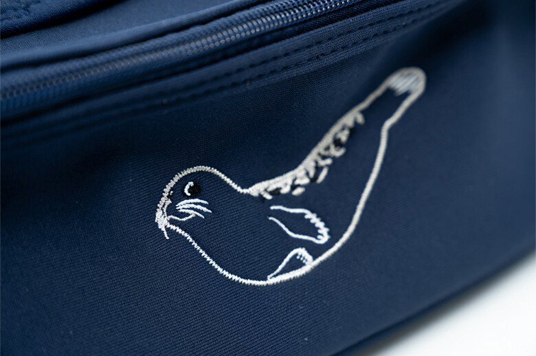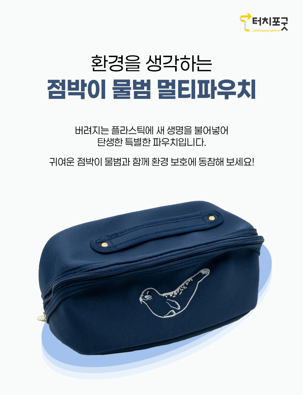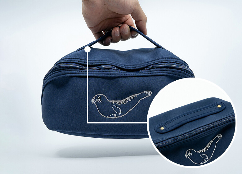 파우치 정면에는 우리나라 해양보호생물인 점박이 물범의 귀여운 모습이 자수로 새겨져 있습니다.
