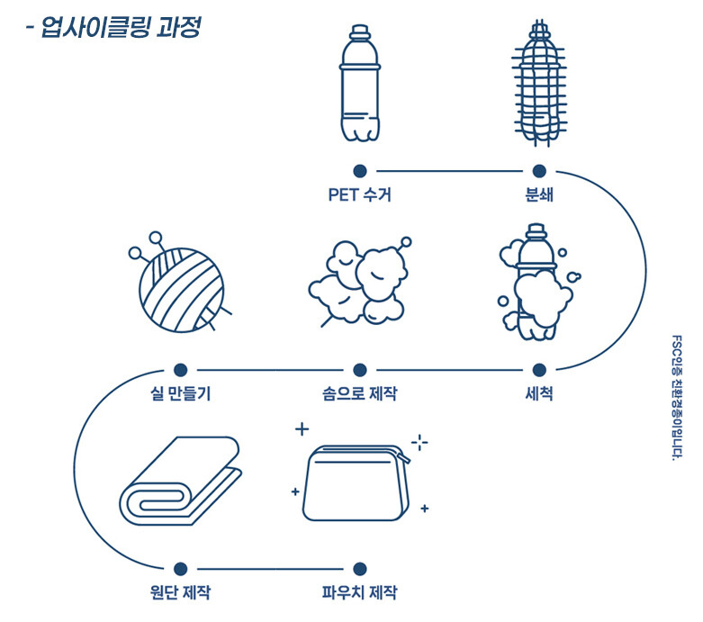 이 파우치는 버려진 플라스틱을 재활용하여 만든 업사이클링 원단으로 제작되었습니다.