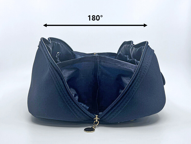 파우치가 180도로 완전히 펼쳐지는 구조로 되어 있어 한눈에 내용물을 확인할 수 있습니다.