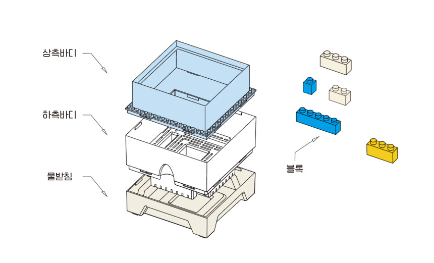 소재 PP (마스크 업사이클 플라스틱; 상단부, 하단부, 블록 / 재생 플라스틱; 물받이)