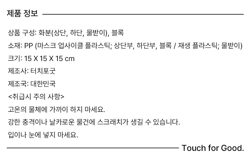 귀여운 색상의 블록 형태로 다양하게 조립할 수 있는 모듈 구조로, 마스크를 업사이클링해 만든 가볍고 귀여운 화분입니다. 터치포굿의 업사이클링 소재로 만들어진 친환경 저면관수 블록 화분으로, 다양한 소재와 블록 모형으로 꾸준히 사랑받고 있습니다.