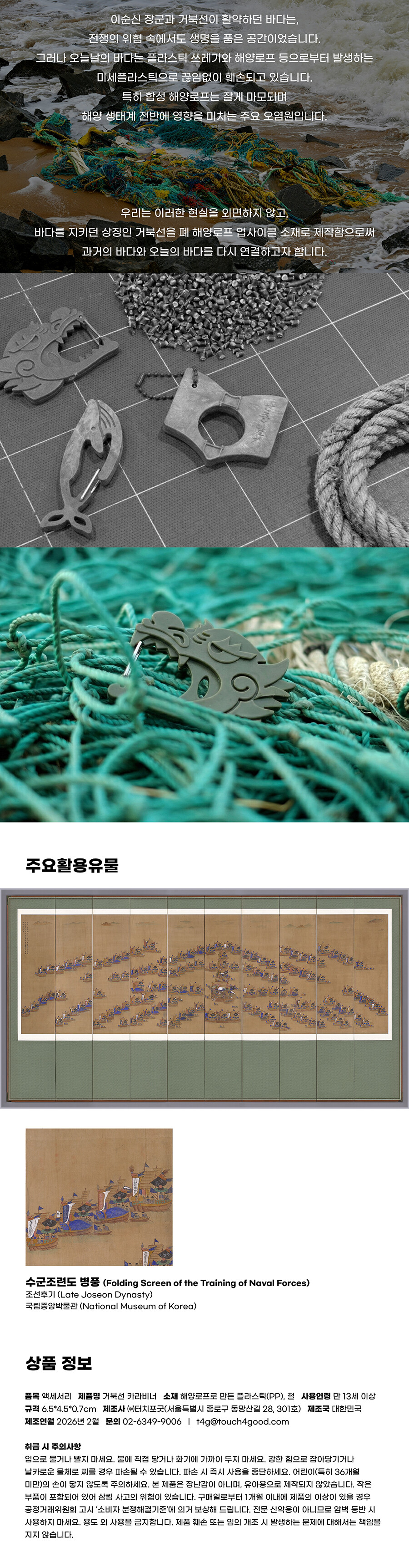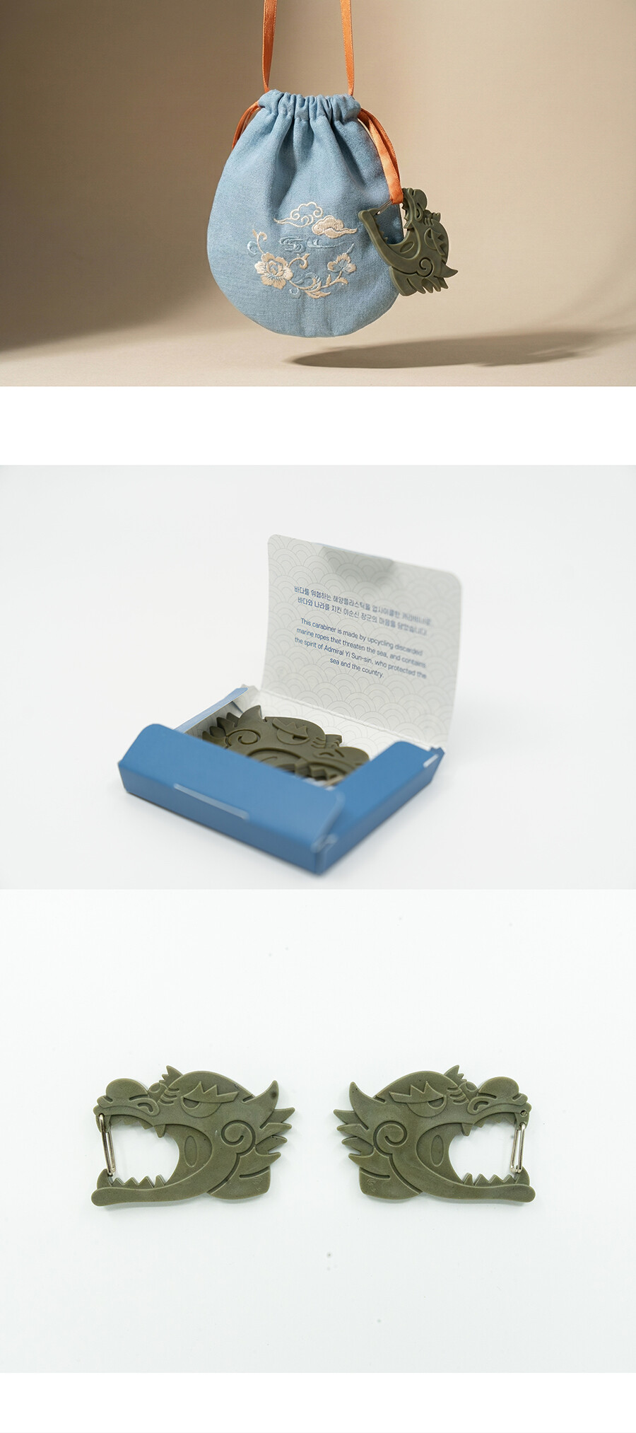 거북선 카라비너는 거북선의 상징적 의미를 일상에서 사용 가능한 장식 오브제로 재해석한 업사이클 디자인 제품입니다. 가방·열쇠·소지품 등에 걸어 쓰는 작은 장식품으로서 거북선과 이순신 장군의 정신을 매일 마주할 수 있습니다.