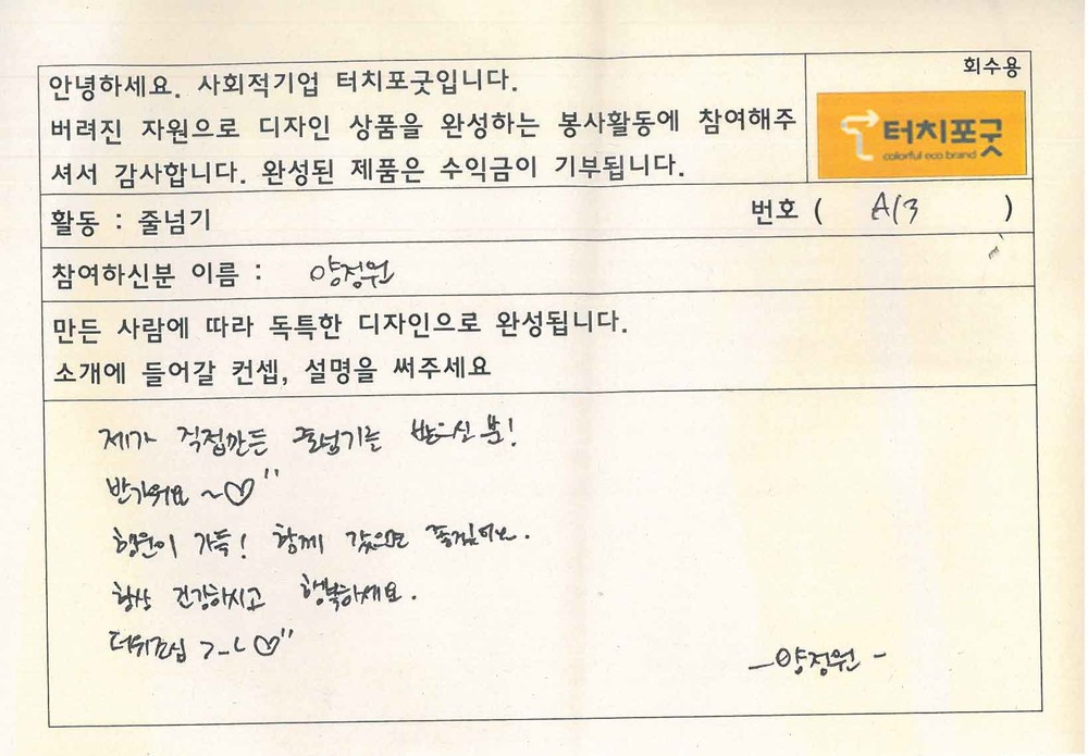 “제가 직접만든 줄넘기를 받으신 분! 반가워요~ (하트) 행운이 가득! 함께 갔으면 좋겠어요. 항상 건강하시고 행복하세요. 더위조심 >_< (하트)”
