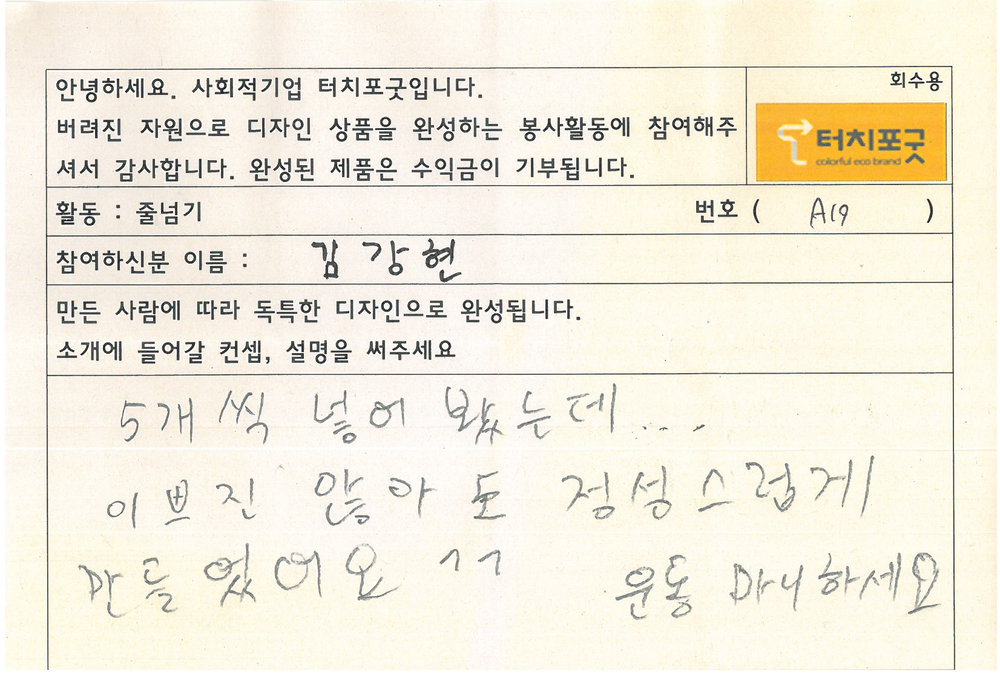“5개씩 넣어 봤는데.. 이쁘진 않아도 정성스럽게 만들었어요. ^^ 운동 마니 하세요.”