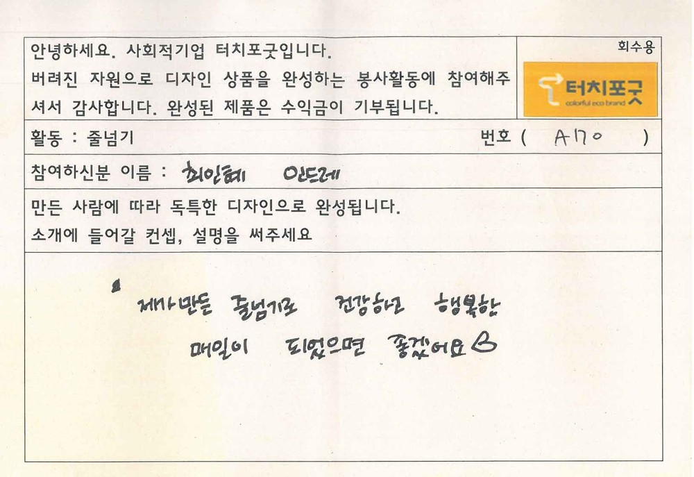 “제가 만든 줄넘기로 건강하고 행복한 매일이 되었으면 좋겠어요 (하트)”