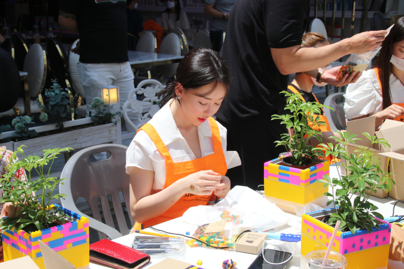 색색의 블록들을 꾹꾹 눌러담아 세상에 하나뿐인 화분을 디자인했습니다.
